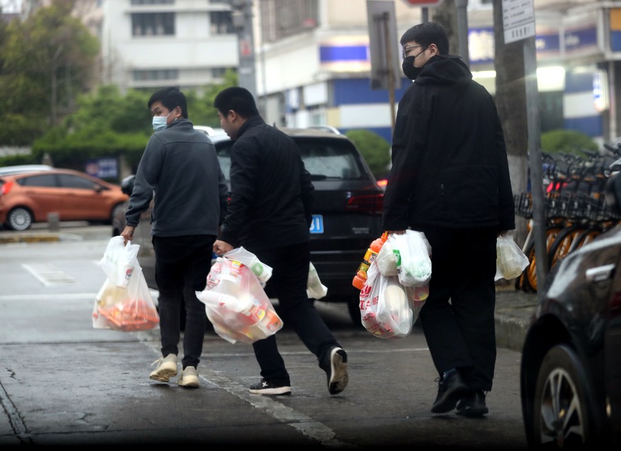 Residents walk with essentials they bought from a supermarket in Minhang District of east China's Shanghai, March 31, 2022. (Xinhua/Liu Ying)