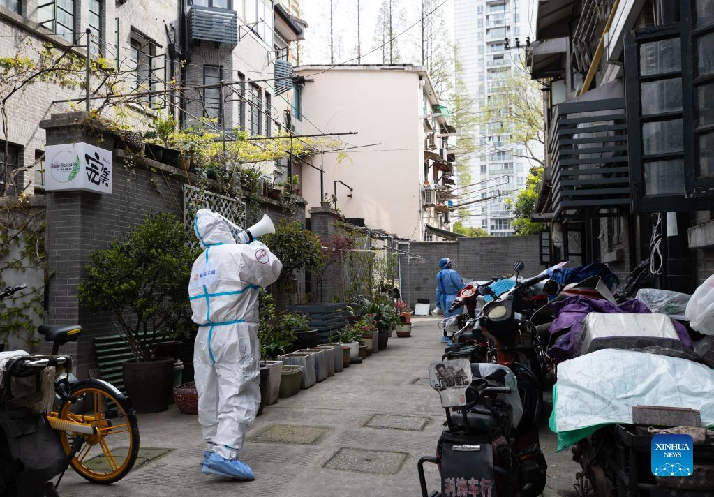 Community workers inform residents to come for nucleic acid test in Changning District of east China's Shanghai, April 1, 2022. Shanghai has launched a nucleic acid testing campaign in areas west of the Huangpu River from Friday amid the second phase of the city's closed-off management. (Xinhua/Jin Liwang)