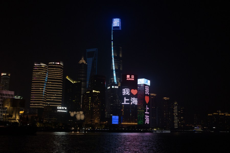 Photo taken on March 31, 2022 shows a big screen displaying "I Love Shanghai" in Chinese at the Bund in east China's Shanghai. (Xinhua/Jin Liwang)
