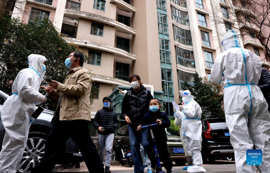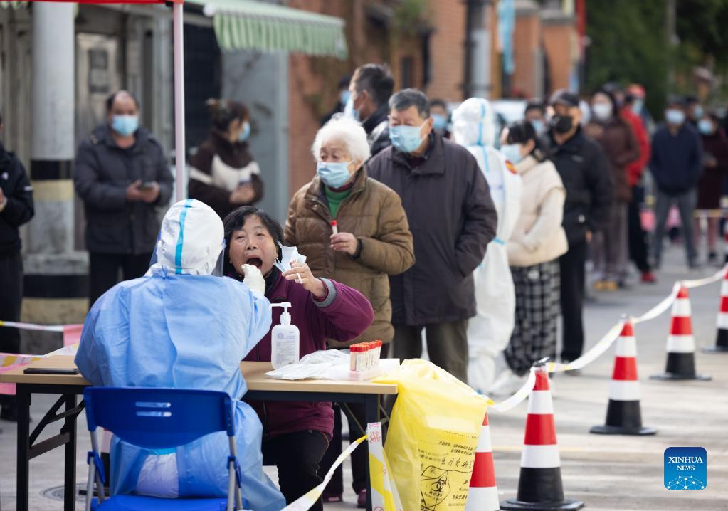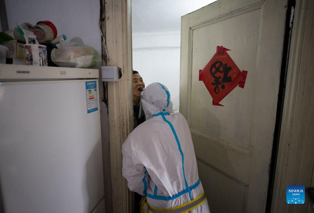 Medical staff take swab samples from residents for nucleic acid test at a residential community in Songjiang District of east China's Shanghai, April 1, 2022. The second phase of closed-off management in Shanghai has come into force in areas west of the Huangpu River on Friday amid a recent spike in COVID-19 infections, according to local authorities. As scheduled, nucleic acid testing will be held from Friday to April 5 for around 16 million people, and 12 districts will be put under temporary closed-off management. (Xinhua/Liu Ying)