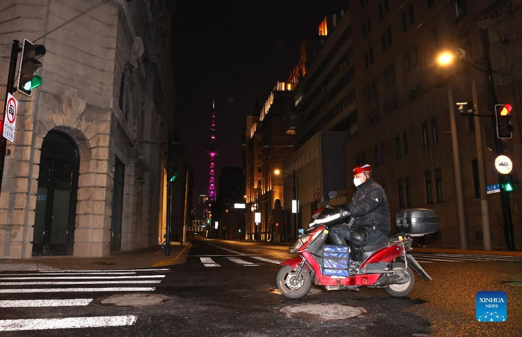 A staff member delivers vegetables at a residential community during night time in east China's Shanghai, March 31, 2022. The second phase of closed-off management in Shanghai has come into force in areas west of the Huangpu River on Friday amid a recent spike in COVID-19 infections, according to local authorities. As scheduled, nucleic acid testing will be held from Friday to April 5 for around 16 million people, and 12 districts will be put under temporary closed-off management. (Xinhua/Jin Liwang)