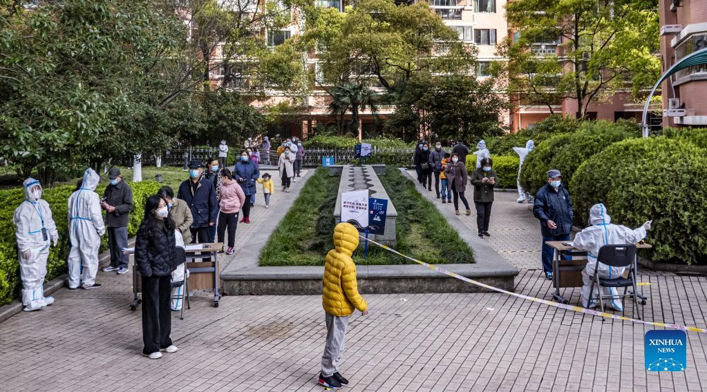 Residents queue to do nucleic acid test at a community in Hongkou District of east China's Shanghai, April 1, 2022. The second phase of closed-off management in Shanghai has come into force in areas west of the Huangpu River on Friday amid a recent spike in COVID-19 infections, according to local authorities. As scheduled, nucleic acid testing will be held from Friday to April 5 for around 16 million people, and 12 districts will be put under temporary closed-off management. (Photo by Yang Fan/Xinhua)