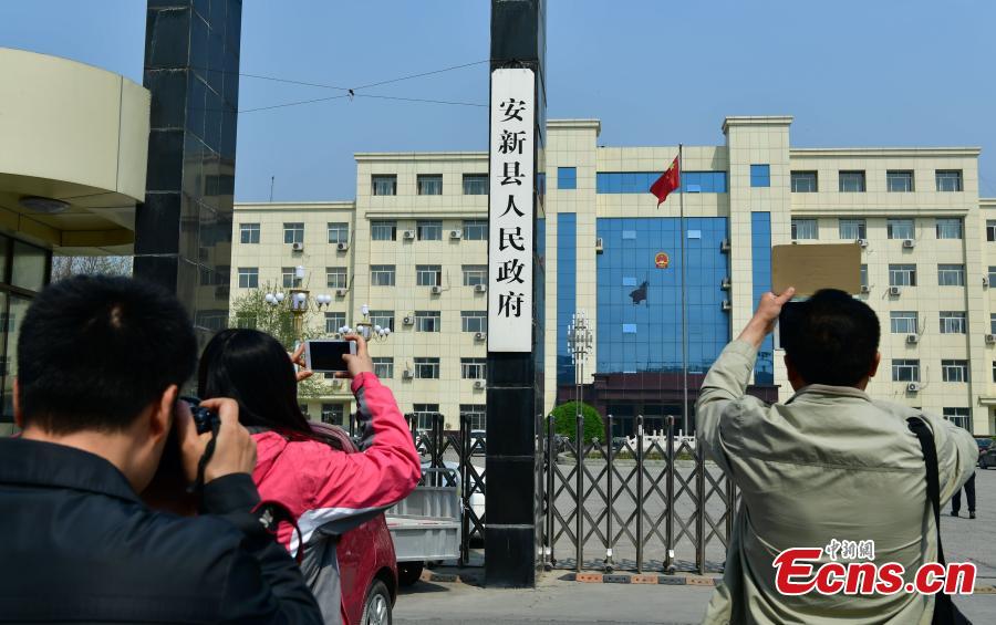 People take photos of the People's Government of Anxin County, north China's Hebei Province, April 3, 2017. (Photo: China News Service/Zhai Yujia)