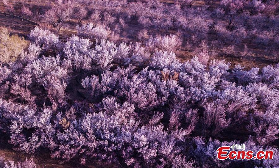 Dozens of hectares of apricot blossoms at the foot of Mingsha Mountain attract visitors to enjoy the pink desert scenery in Dunhuang, northwest China's Gansu Province in March. (Photo: China News Service/Wang Binyin)