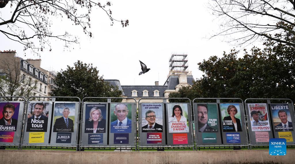Electoral posters of the candidates of France's presidential elections are pictured in Paris, France, April 1, 2022. France's presidential election is scheduled for April 2022. If no candidate wins the absolute majority of the votes cast in the first election round on April 10, the top two candidates will progress to a runoff vote on April 24. (Xinhua/Gao Jing)