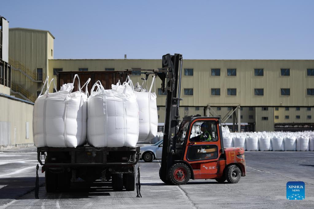 A staff member loads potash fertilizer onto a truck at a potash fertilizer company in northwest China's Qinghai Province, April 1, 2022. Production of potash fertilizer is in full swing in Qinghai to help reinforce the spring farming. (Xinhua/Wang Bo)