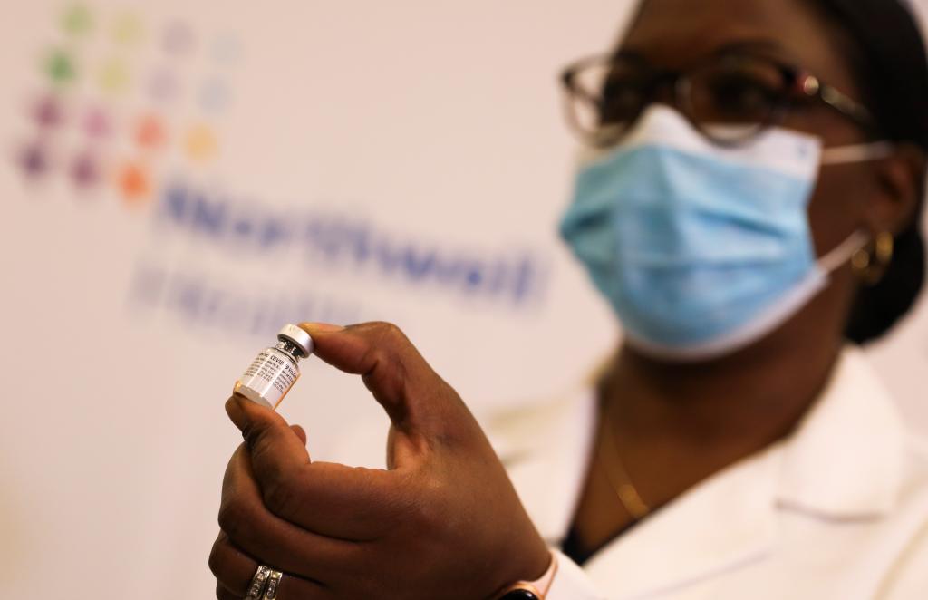 A healthcare worker shows a vial of the COVID-19 vaccine at Long Island Jewish Medical Center in New York, the United States, on Dec. 14, 2020. (Xinhua/Wang Ying)