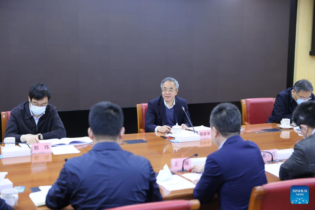 Chinese Vice Premier Hu Chunhua, also a member of the Political Bureau of the Communist Party of China Central Committee, chairs a symposium on foreign trade situations in Beijing, capital of China, April 2, 2022. (Xinhua/Liu Bin)