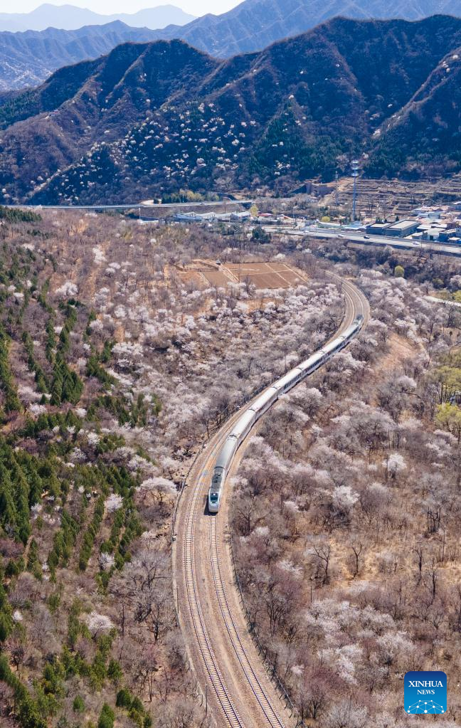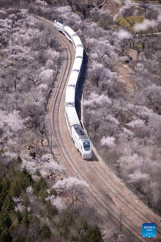 In this aerial photo, a suburban train runs amid blooming flowers near the Juyongguan section of the Great Wall in Beijing, capital of China, April 2, 2022. (Xinhua/Chen Zhonghao)
