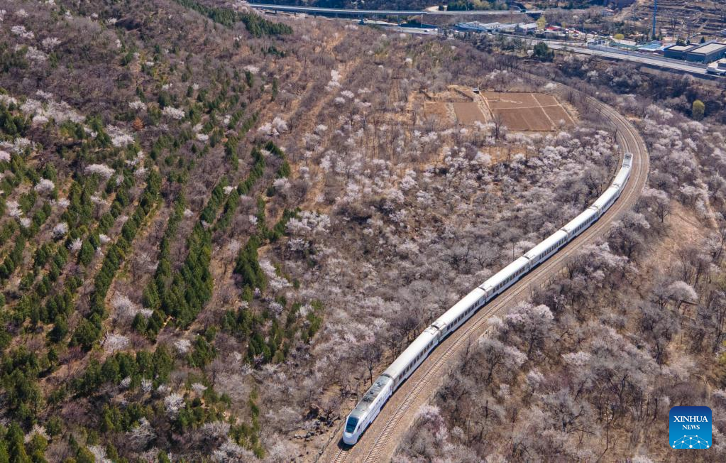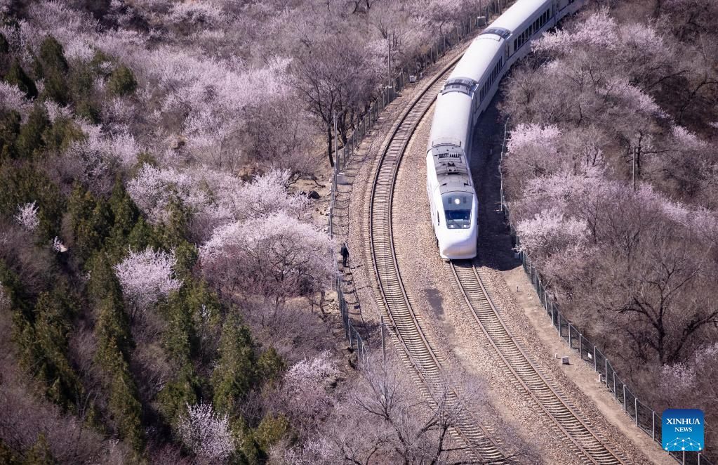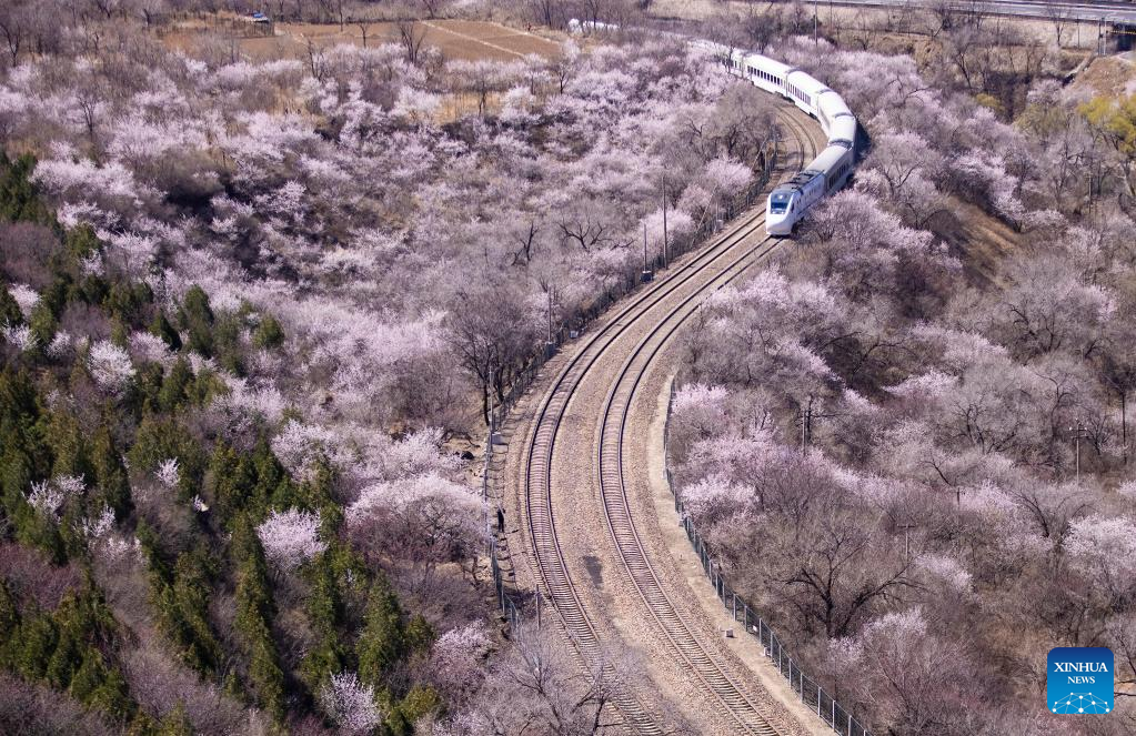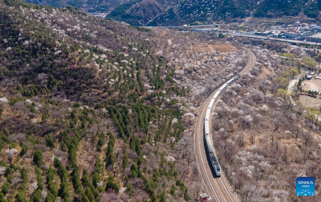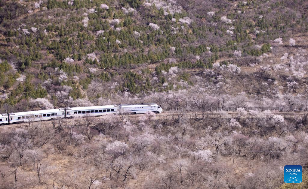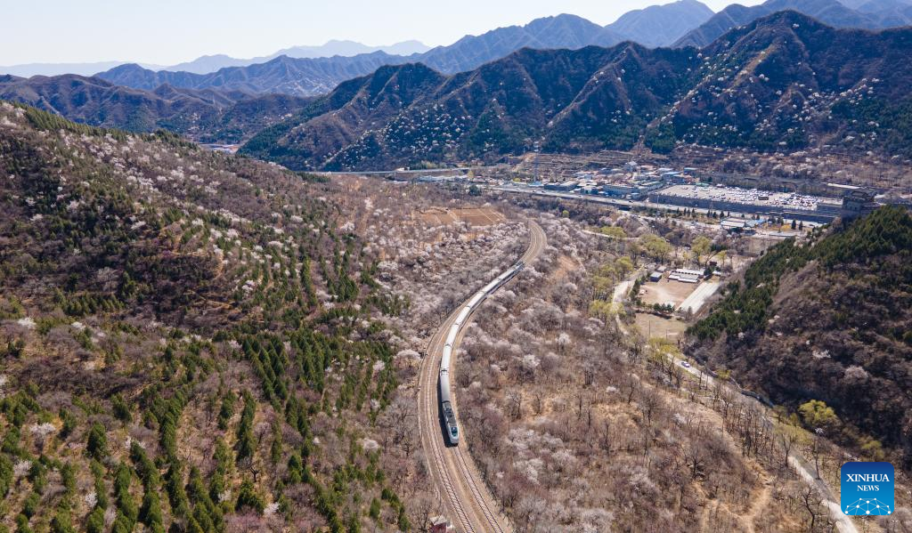 A suburban train runs amid blooming flowers near the Juyongguan section of the Great Wall in Beijing, capital of China, April 2, 2022. (Xinhua/Li Mengxin)