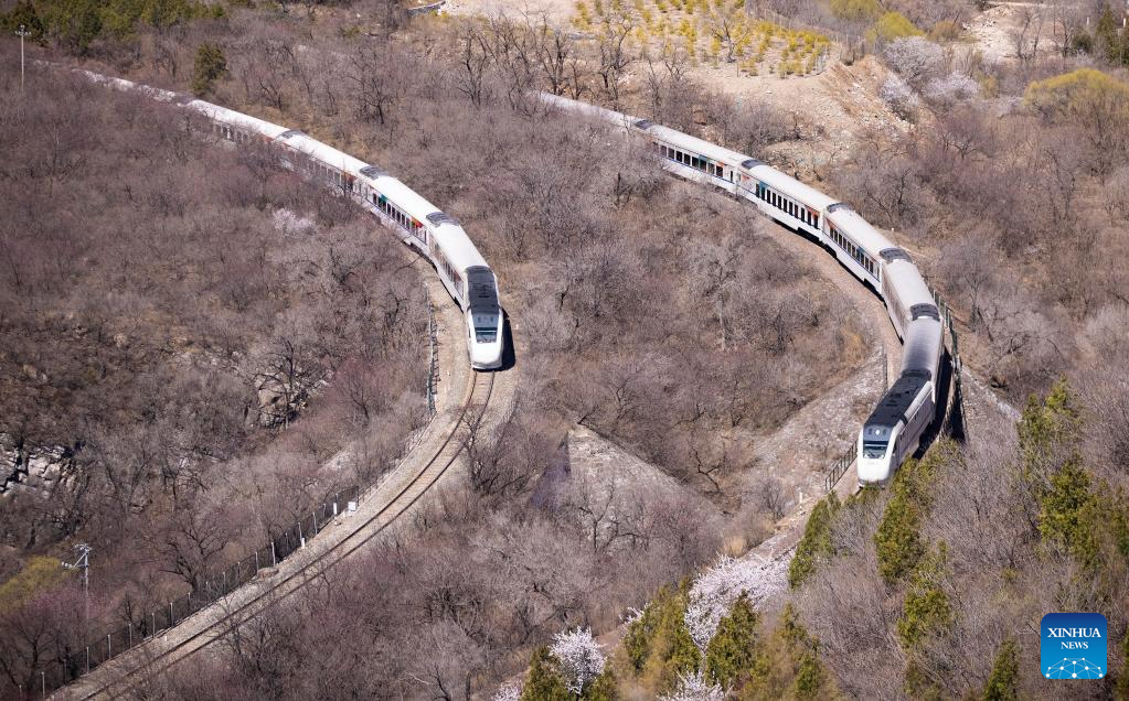 Suburban trains run amid blooming flowers near the Juyongguan section of the Great Wall in Beijing, capital of China, April 2, 2022. (Xinhua/Li Mengxin)