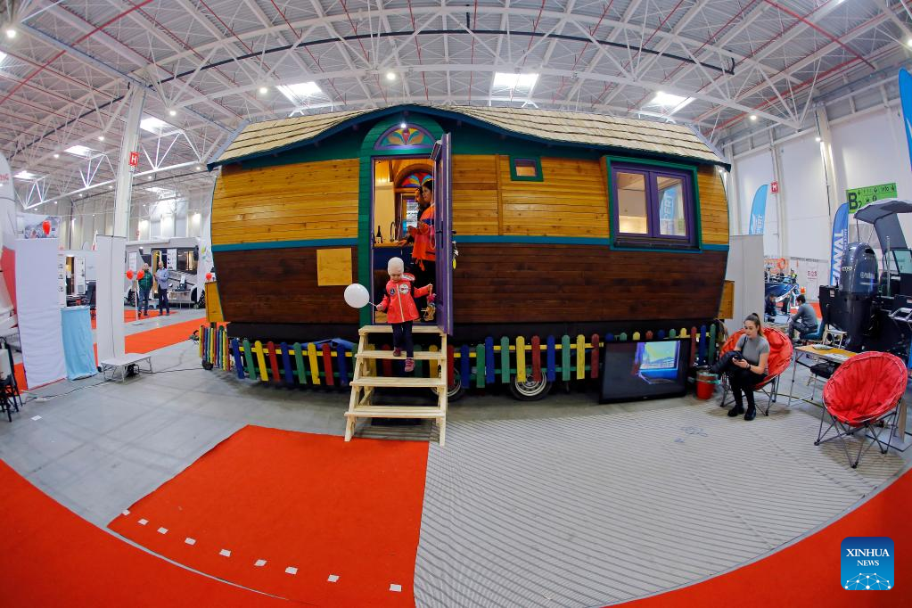 A child leaves a holiday and living house during the Bucharest International Boat Show, Caravan, Motorhome and Adventure Fair in Bucharest, Romania, on April 2, 2022. (Photo by Cristian Cristel/Xinhua)