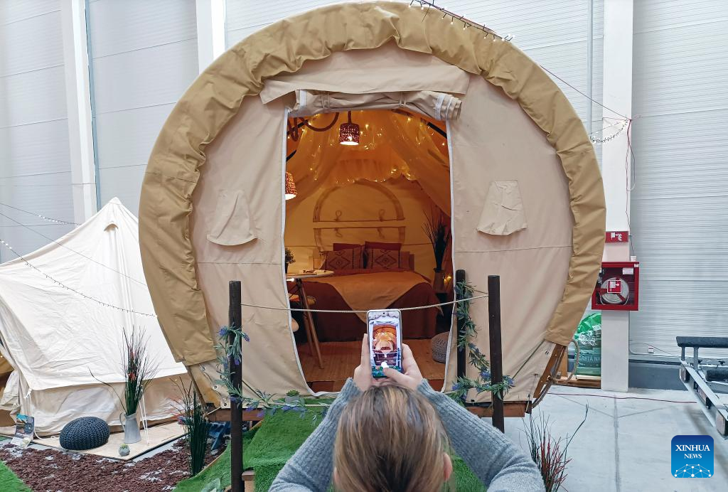 A woman takes a picture of a holiday cart during the Bucharest International Boat Show, Caravan, Motorhome and Adventure Fair in Bucharest, Romania, on April 2, 2022. (Photo by Cristian Cristel/Xinhua)