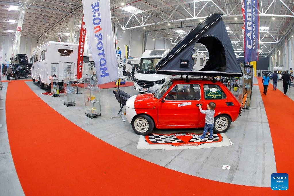 A child is seen next to a vehicle equipped with a tent on its top during the Bucharest International Boat Show, Caravan, Motorhome and Adventure Fair in Bucharest, Romania, on April 2, 2022. (Photo by Cristian Cristel/Xinhua)