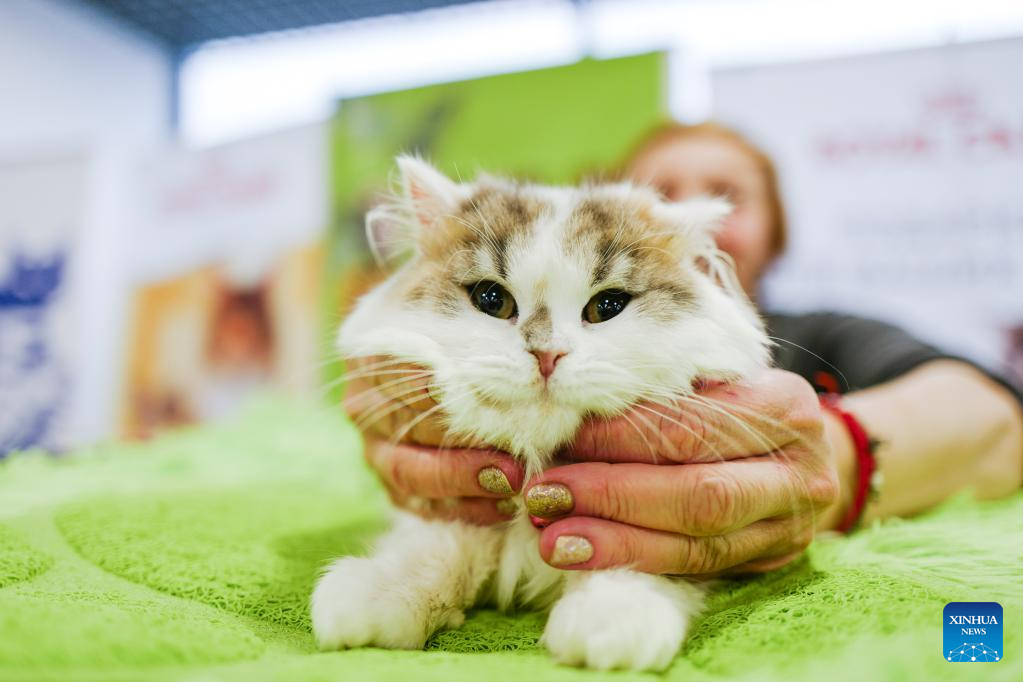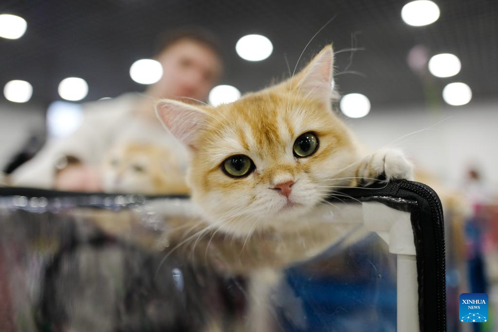 A cat is seen during a cat show in Moscow, Russia, April 2, 2022. Over 300 cats of more than 25 breeds participated in this cat show. (Xinhua/Bai Xueqi)