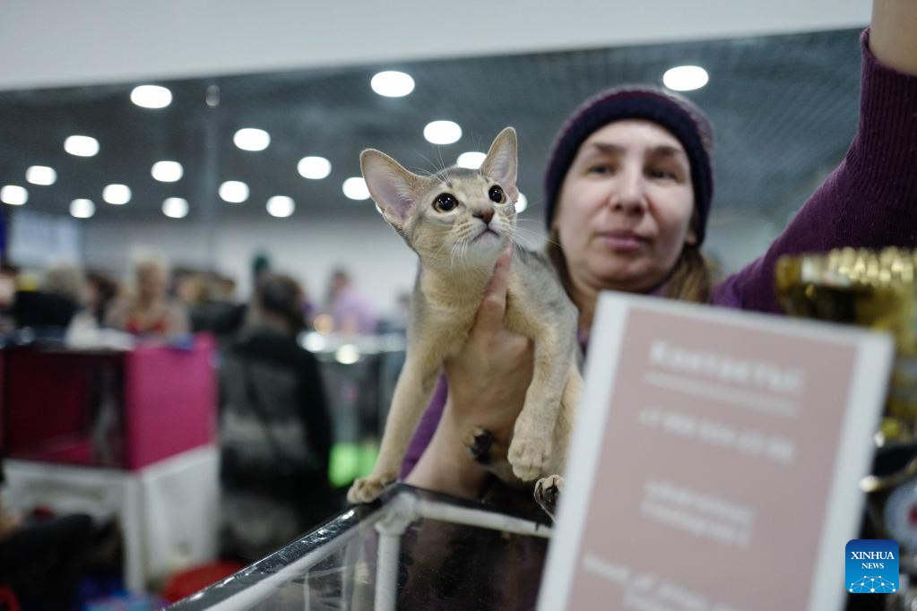 A woman shows a cat during a cat show in Moscow, Russia, April 2, 2022. Over 300 cats of more than 25 breeds participated in this cat show. (Xinhua/Bai Xueqi)