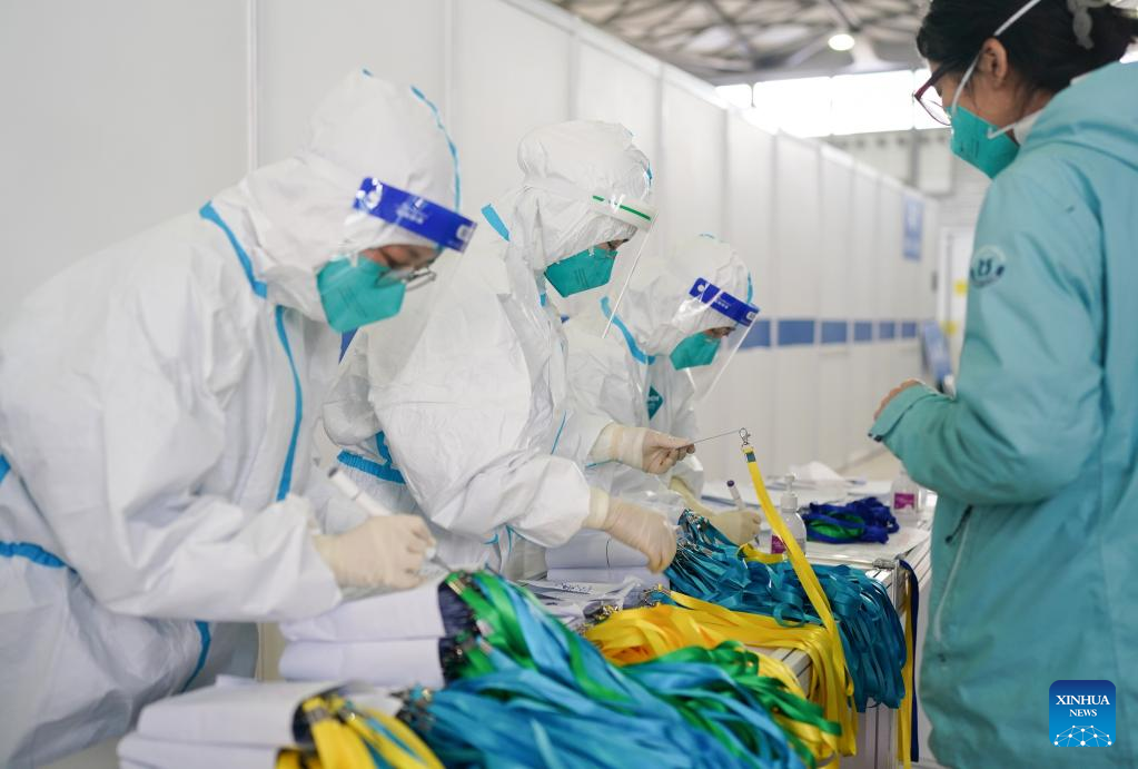 Medical workers work in the quarantine zone at the Shanghai New International Expo Center in east China's Shanghai, April 1, 2022. (Xinhua)