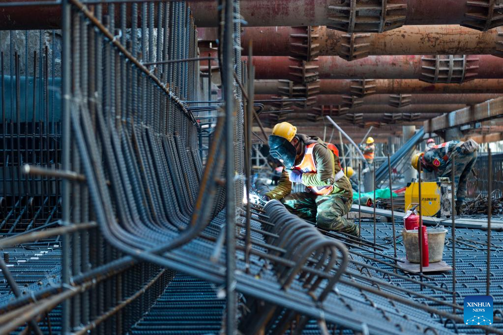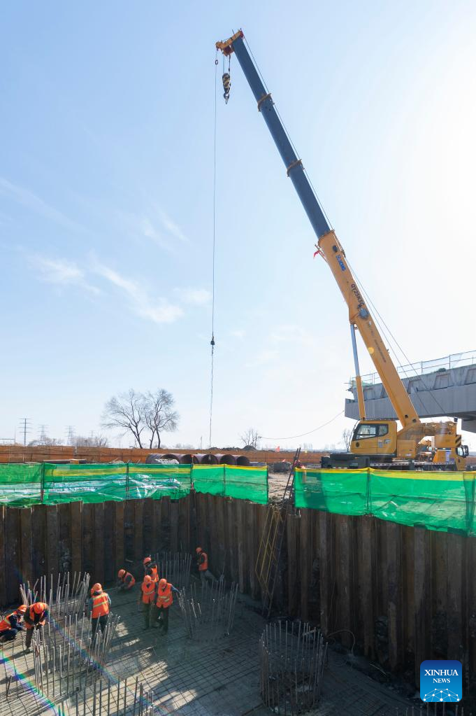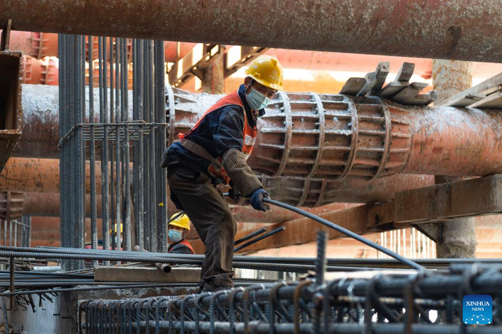 Workers are seen at the construction site of a metro line in Harbin, northeast China's Heilongjiang Province, April 3, 2022. Construction workers are busy building projects here in spring time. (Xinhua/Xie Jianfei)