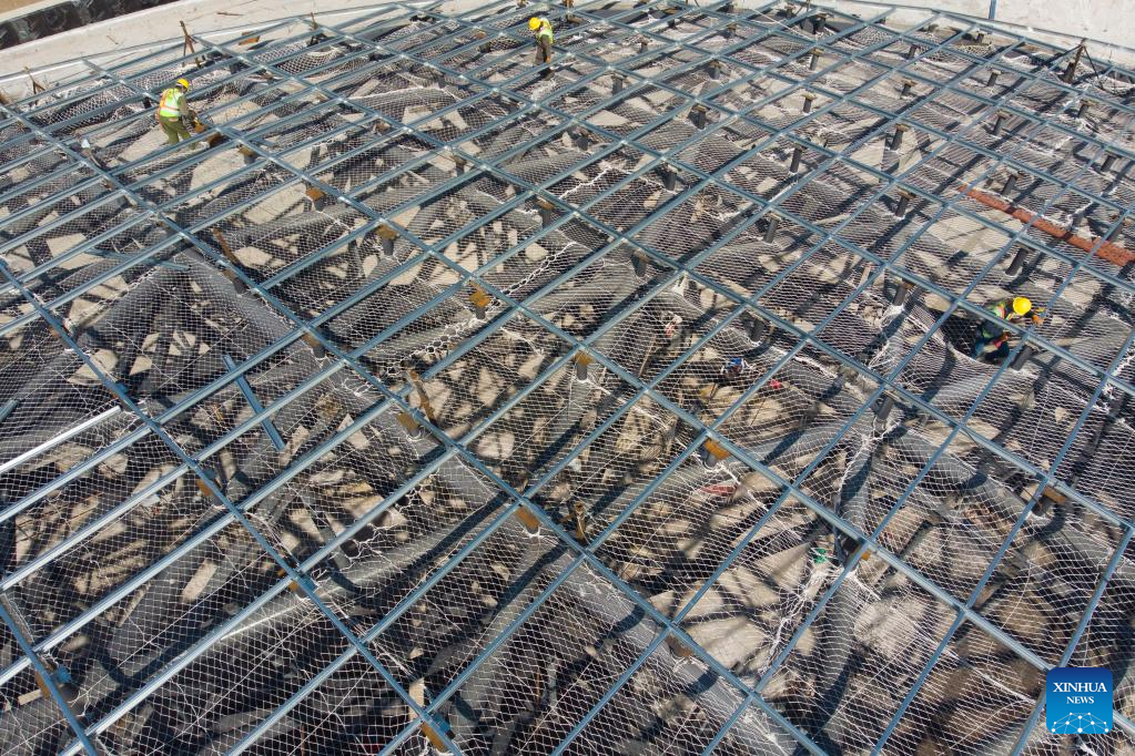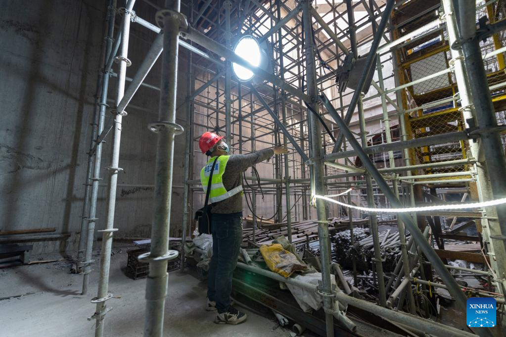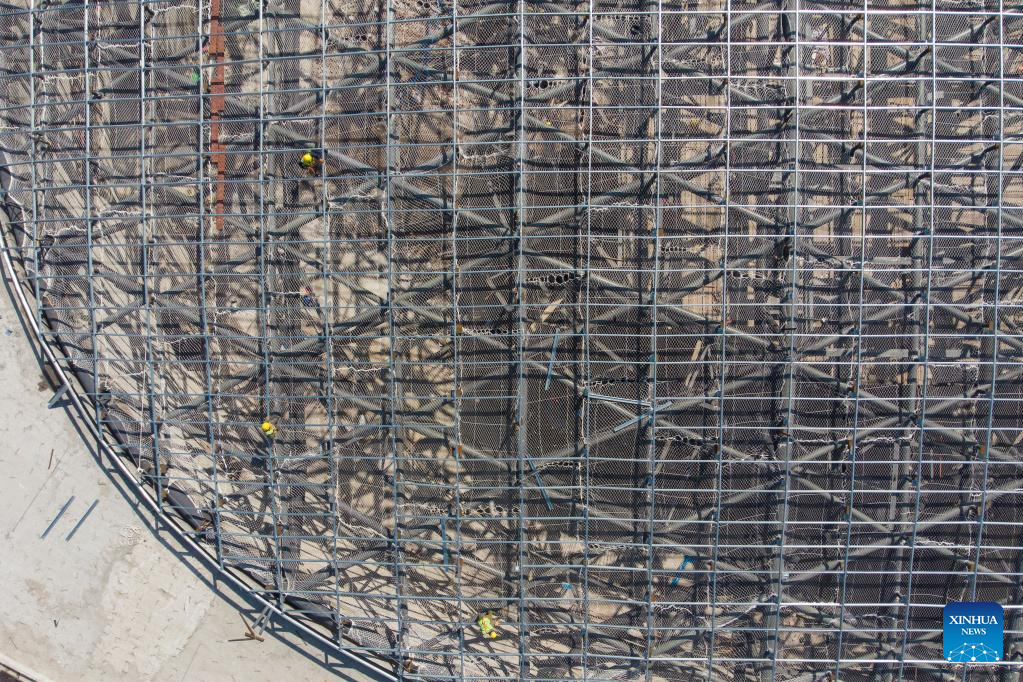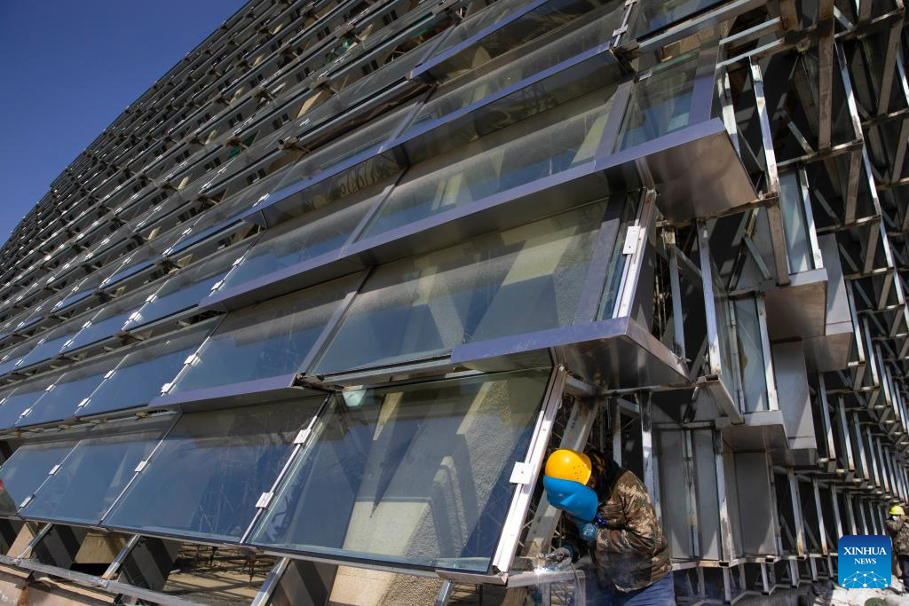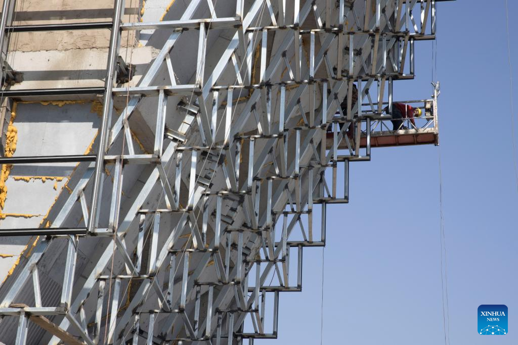 Workers are seen at the construction site at Harbin Ice-Snow World in Harbin, northeast China's Heilongjiang Province, April 3, 2022. Construction workers are busy building projects here in spring time. (Xinhua/Zhang Tao)