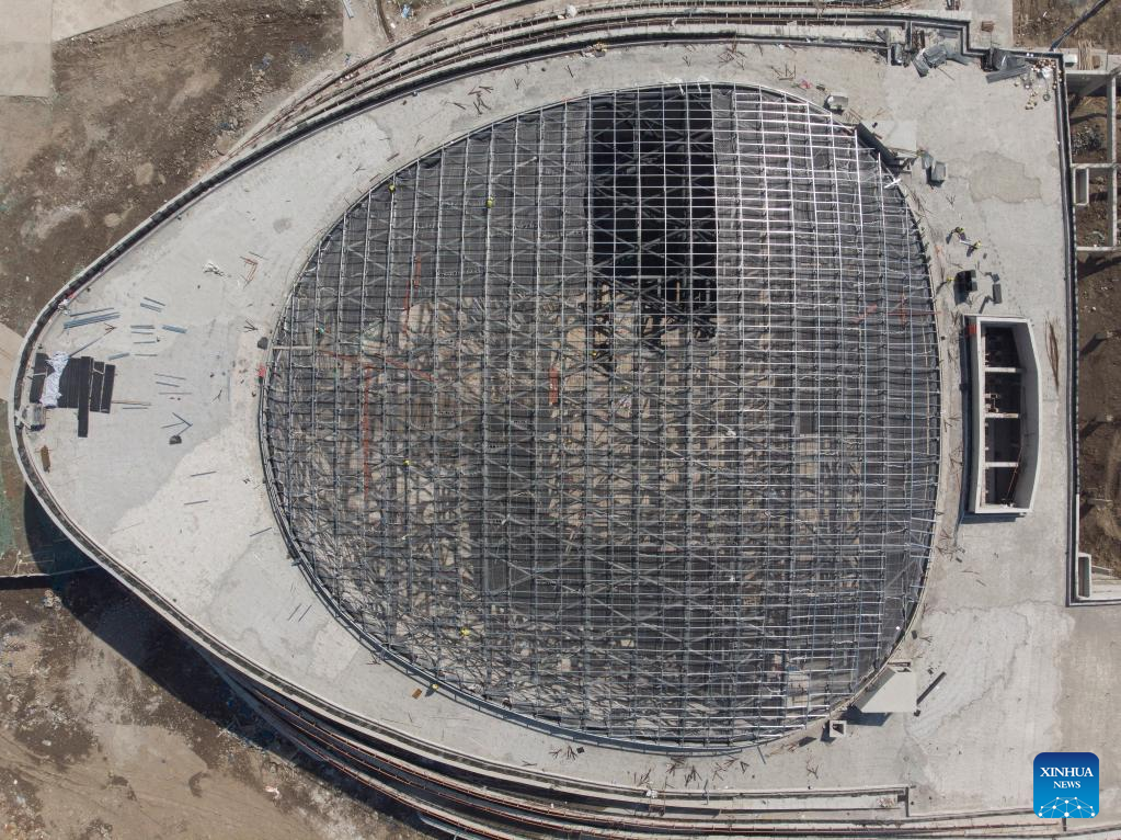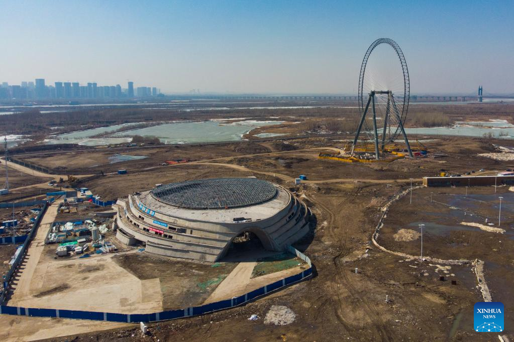 Aerial photo taken on April 3, 2022 shows the construction site at Harbin Ice-Snow World in Harbin, northeast China's Heilongjiang Province. Construction workers are busy building projects here in spring time. (Xinhua/Zhang Tao)