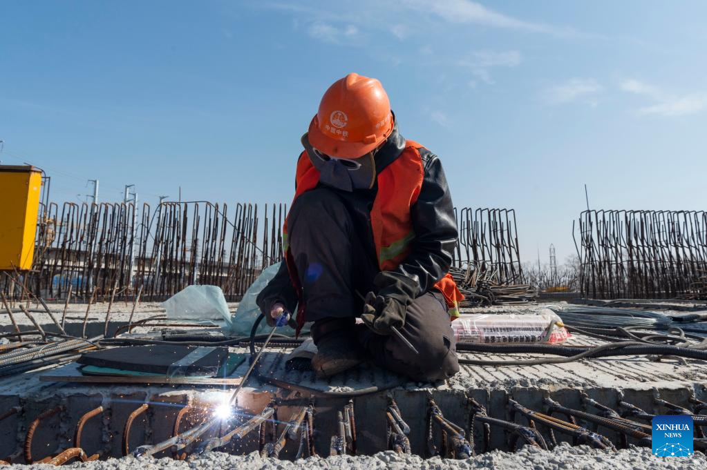 A worker is seen at the construction site of bridges in Harbin, northeast China's Heilongjiang Province, April 3, 2022. Construction workers are busy building projects here in spring time. (Xinhua/Xie Jianfei)