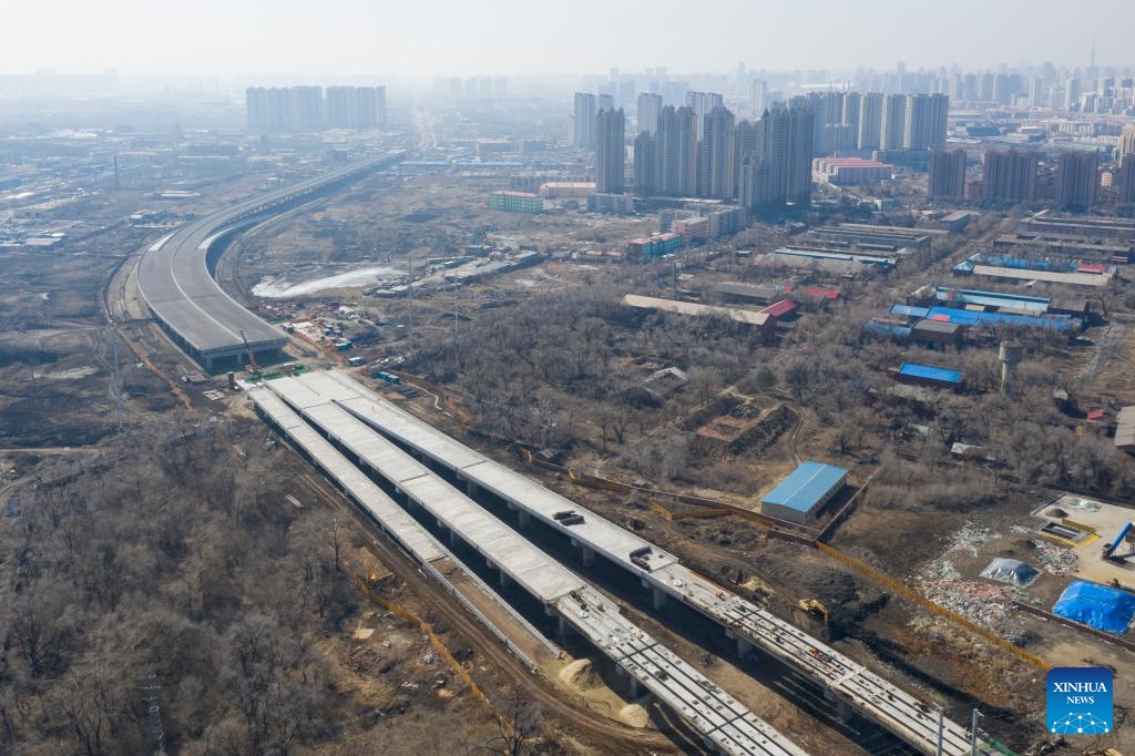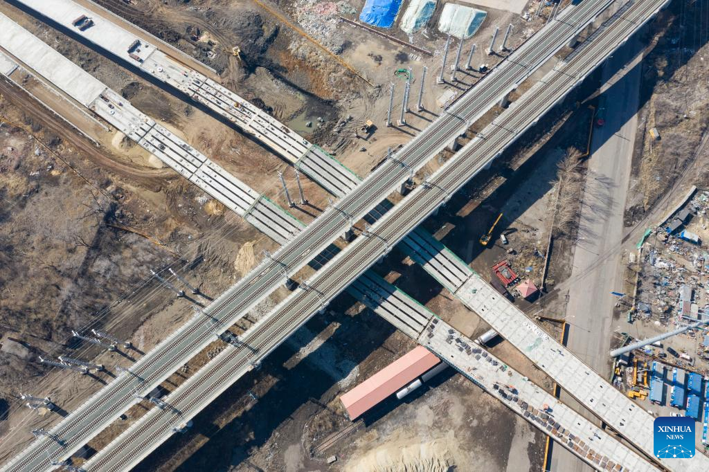Aerial photo taken on April 3, 2022 shows the construction site of bridges in Harbin, northeast China's Heilongjiang Province. Construction workers are busy building projects here in spring time. (Xinhua/Xie Jianfei)