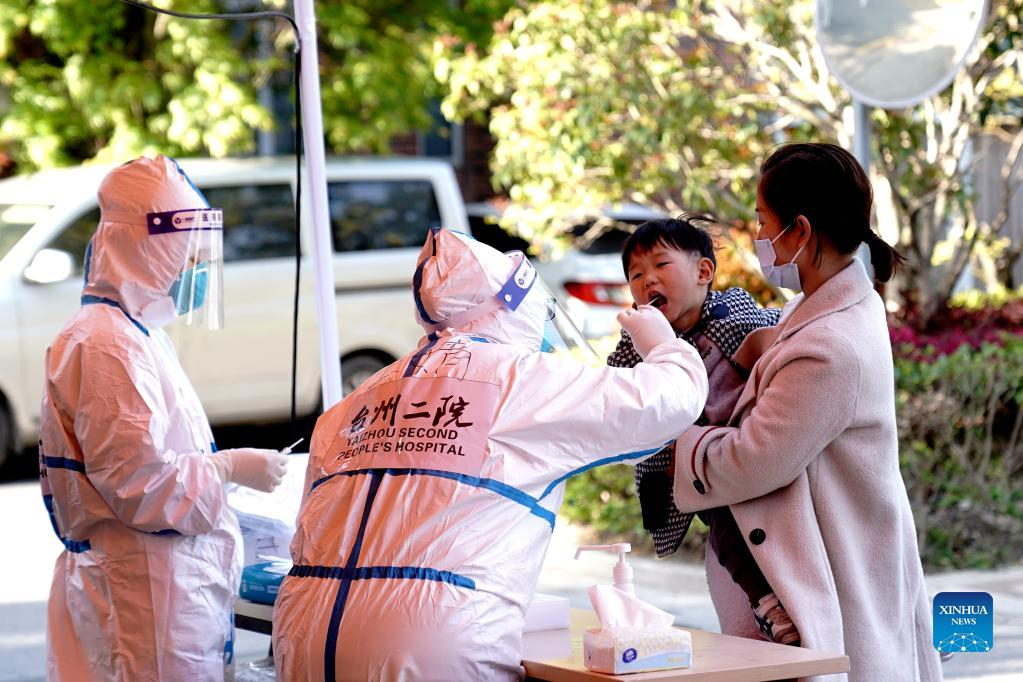 A medical worker from east China's Zhejiang Province takes a swab sample from a child for nucleic acid test at a community in Songjiang District of Shanghai, east China, April 4, 2022. Amid rising numbers of COVID-19 infections in its latest resurgence, Shanghai on Monday launched a citywide nucleic acid testing campaign covering the city's more than 24 million residents. (Xinhua/Zhang Jiansong)