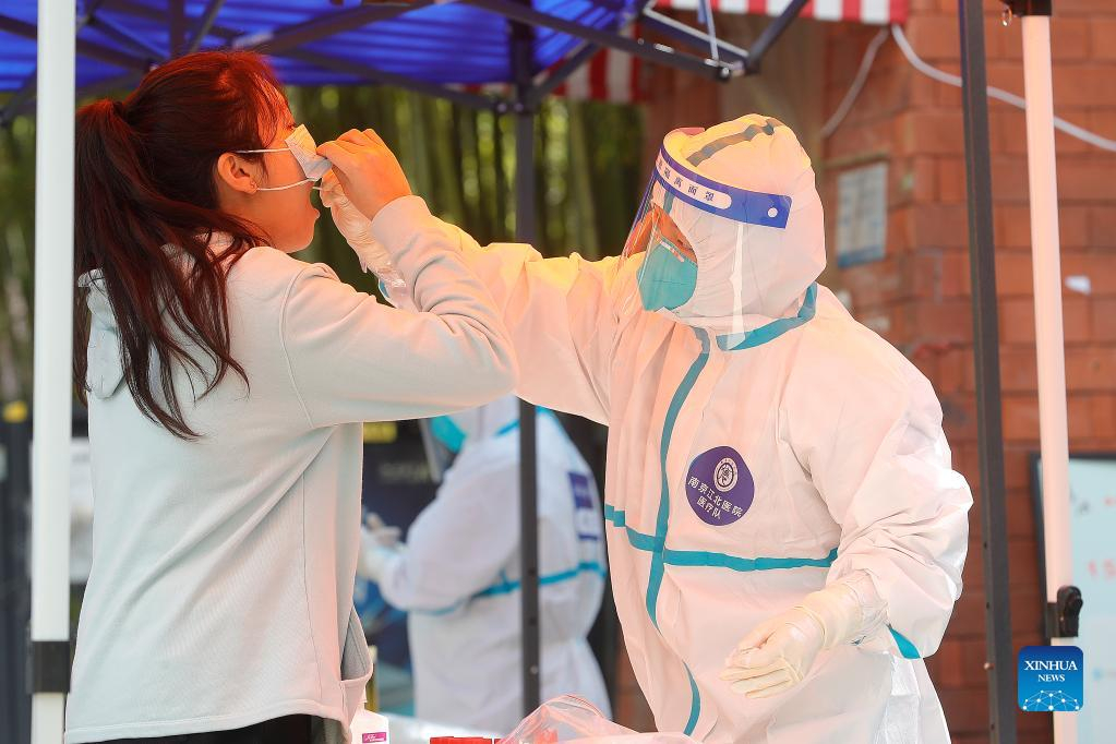 A medical worker from east China's Jiangsu Province takes a swab sample from a resident for nucleic acid test at a community in Xuhui District of Shanghai, east China, April 4, 2022. Amid rising numbers of COVID-19 infections in its latest resurgence, Shanghai on Monday launched a citywide nucleic acid testing campaign covering the city's more than 24 million residents. (Xinhua/Gao Feng)