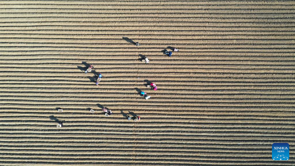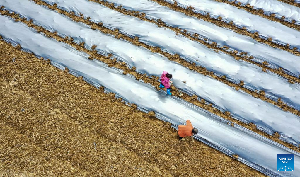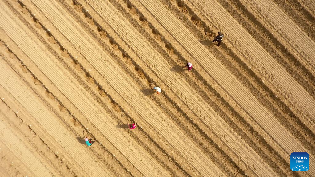 Farmers plant ginger in the field in Donghanzhuang Village, Xiaoji Township, Tangshan City, north China's Hebei Province, April 5, 2022. As the temperature gradually rises around the time of Qingming Festival, farming activities are in full swing across the country, from the north to the south. (Photo by Li Xiuqing/Xinhua)