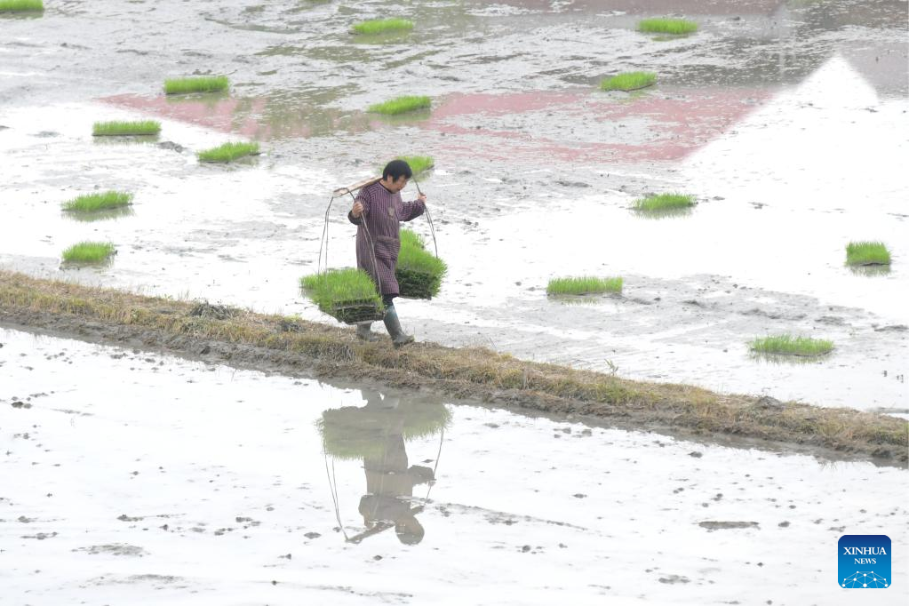 A farmer carries seedlings in the paddy field in Huaqiao Village, Jingzi Township, Shuangfeng County of Loudi, central China's Hunan Province, April 5, 2022. As the temperature gradually rises around the time of Qingming Festival, farming activities are in full swing across the country, from the north to the south. (Photo by Li Jianxin/Xinhua)