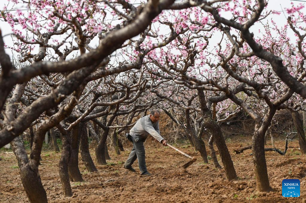 A villager works at a peach orchard in Jiaolou Village, Qingzhou City, east China's Shandong Province, April 5, 2022. As the temperature gradually rises around the time of Qingming Festival, farming activities are in full swing across the country, from the north to the south. (Photo by Wang Jilin/Xinhua)