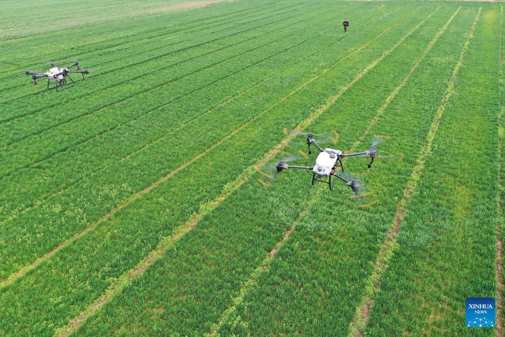 Aerial photo taken on April 5, 2022 shows a farmer using drones to take care of wheat in the field in Duanbolan Township of Jimo District in Qingdao City, east China's Shandong Province. (Photo by Liang Xiaopeng/Xinhua)