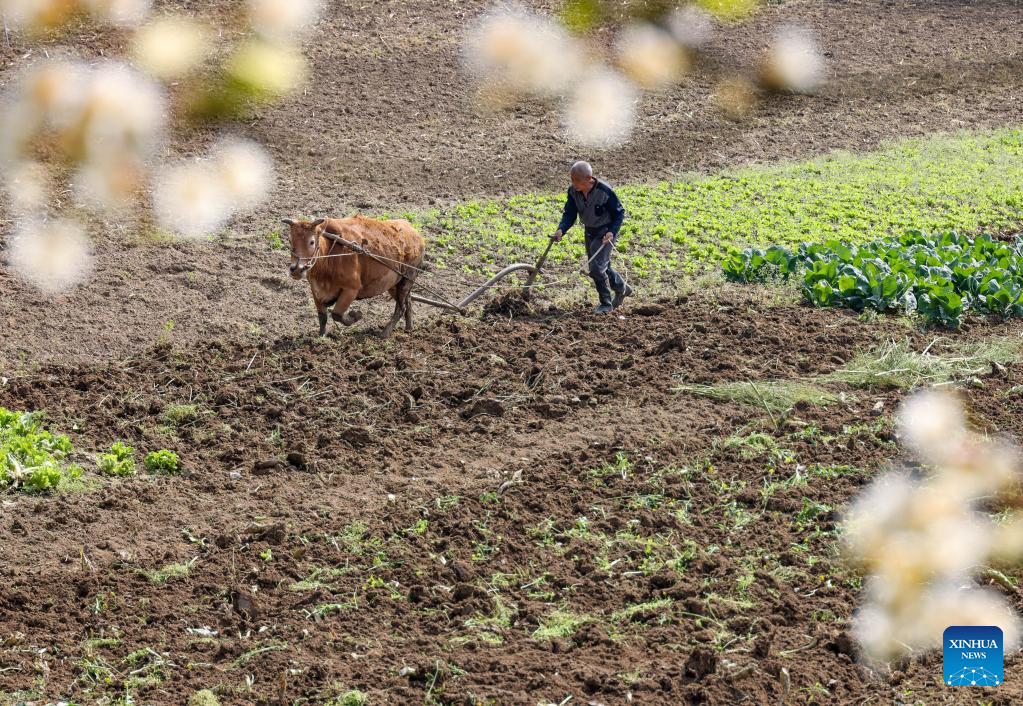 A farmer plows the field in Yangliu Village, Yuping Dong Autonomous County in Tongren, southwest China's Guizhou Province, April 5, 2022. As the temperature gradually rises around the time of Qingming Festival, farming activities are in full swing across the country, from the north to the south. (Photo by Hu Panxue/Xinhua)