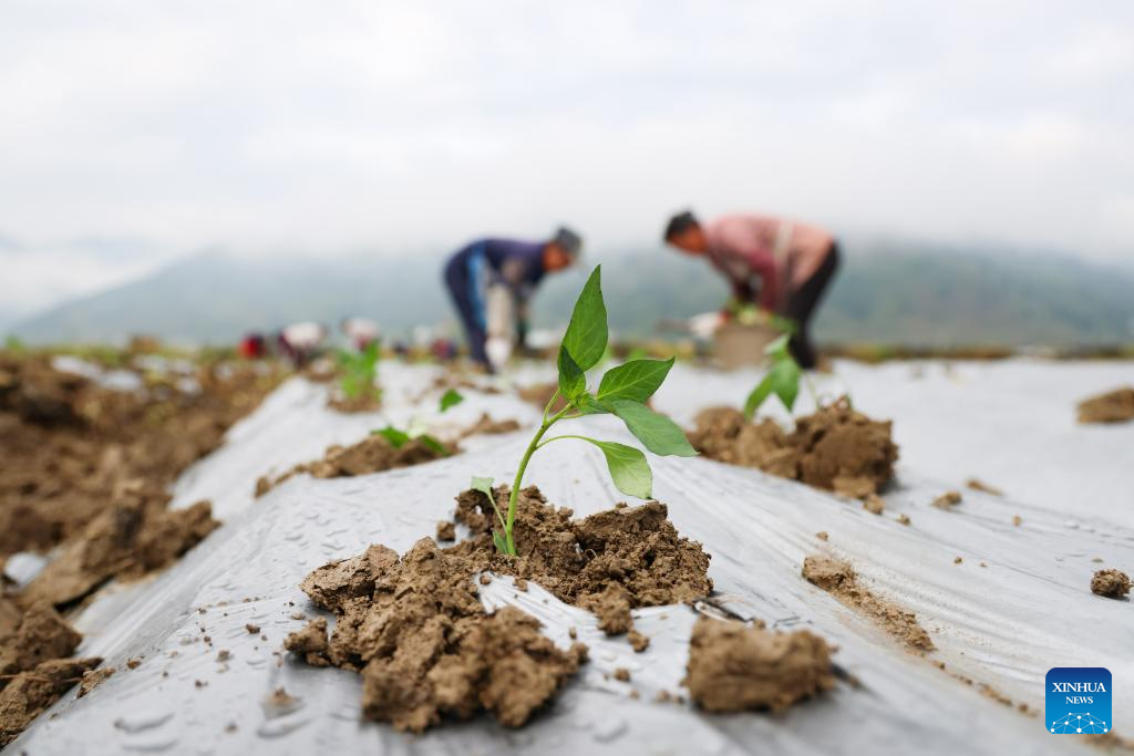 Villagers work at a chili-planting base in Xinzhou Township, Zheng'an County of Zunyi, southwest China's Guizhou Province, April 5, 2022. (Photo by Zhao Yongzhang/Xinhua)