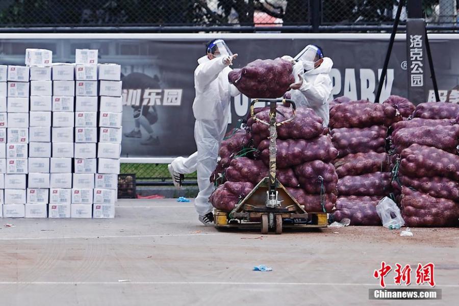 Staff member transport supplies to a temporary warehouse at Hongkou football field in Shanghai, April 5, 2022. Shanghai has set up 10 warehouses for extra storage, increased sources of supplies and coordinated with suppliers to expand procurement channels to boost market supply. (Photo: China News Service/Yin Liqin)
