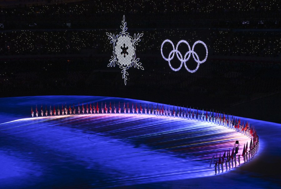 The rising Olympic rings pass by the giant snowflake-shaped cauldron during the closing ceremony of the Beijing 2022 Olympic Winter Games at the National Stadium in Beijing, capital of China, Feb. 20, 2022. (Xinhua/Liu Xiao)