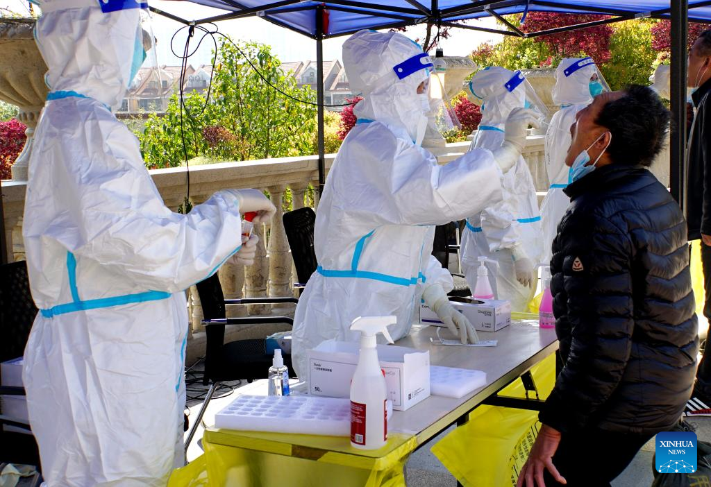 Medical workers from Hainan Province take swab samples from residents for nucleic acid tests at a community in Jiading District of Shanghai, east China, April 6, 2022. Shanghai on Wednesday launched another round of citywide antigen and nucleic acid testing amid efforts to contain the recent resurgence of COVID-19 cases in the metropolis, according to local authorities. The decision was made based on the results of mass nucleic acid testing on Monday, according to the Shanghai municipal leading group for COVID-19 prevention and control. (Xinhua/Wang Shujuan)