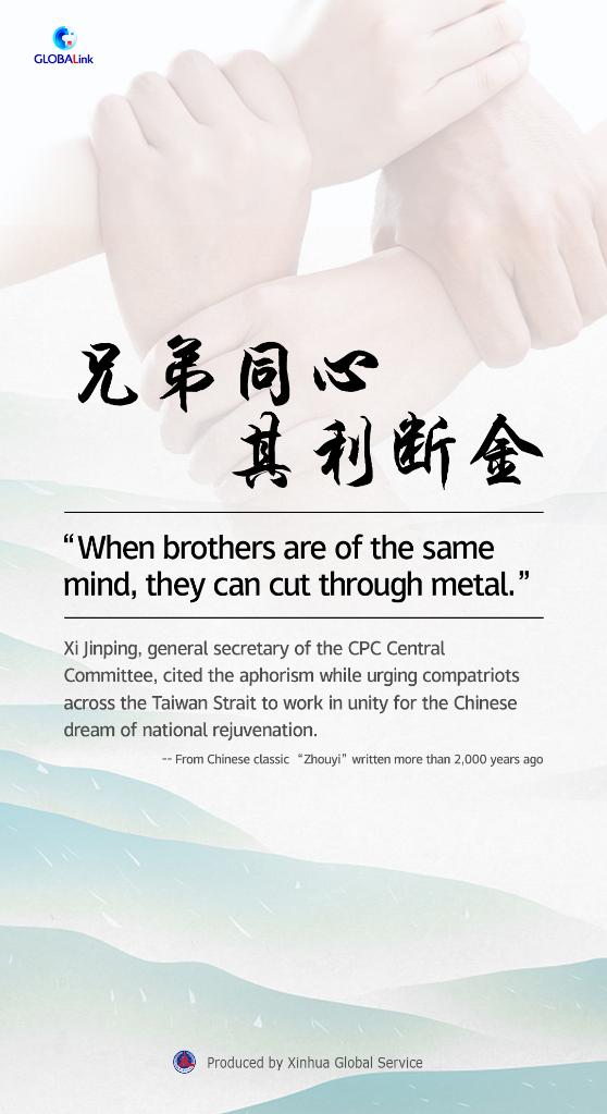 BEIJING, April 6 (Xinhua) -- "When brothers are of the same mind, they can cut through metal." Xi Jinping, general secretary of the Communist Party of China Central Committee, has cited this Chinese aphorism while urging compatriots across the Taiwan Strait to work in unity for the Chinese dream of national rejuvenation.