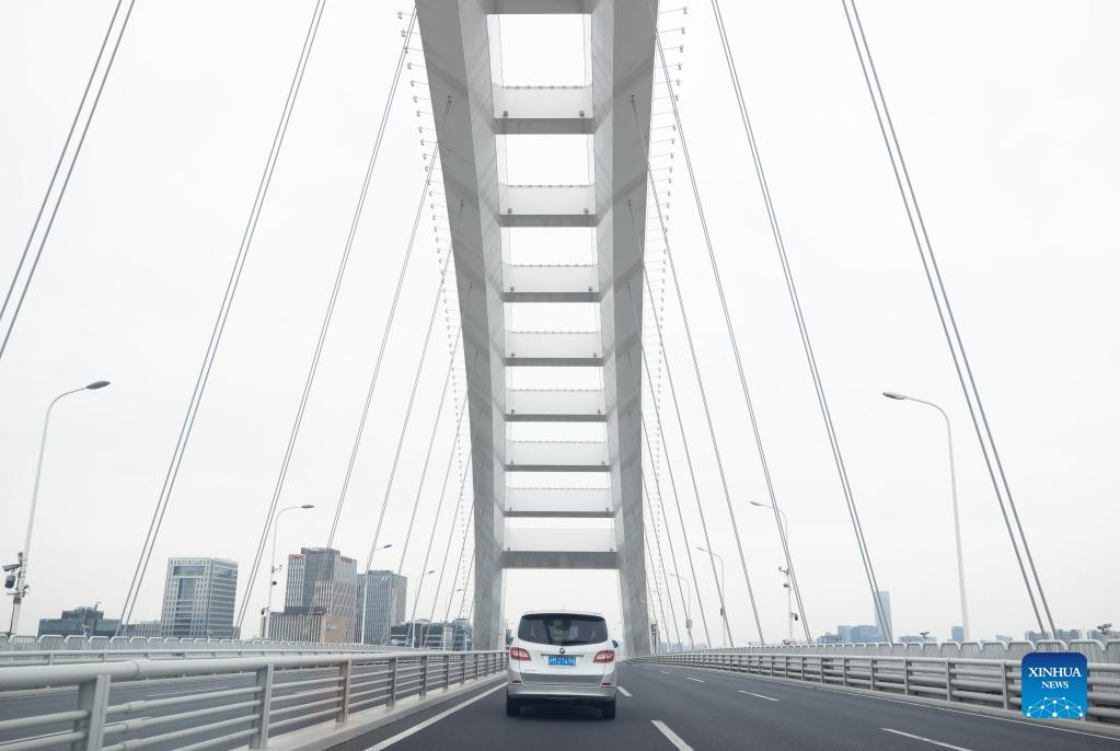 A car delivering medicines runs on the Lupu Bridge in Shanghai, east China, April 5, 2022. During the temporary closed-off management period in Shanghai, supply and delivery of special drugs to those patients who need them is particularly important. A pharmacy called Shanghai Pharma E Pharmacy, which sells more than 260 new drugs, special drugs and drugs for rare diseases, stays in business to supply and deliver the medicines. (Xinhua/Jin Liwang)