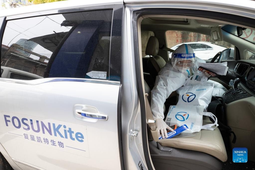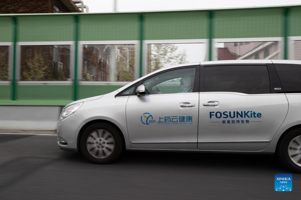 A car of Shanghai Pharma E Pharmacy delivers medicines in Shanghai, east China, April 5, 2022. During the temporary closed-off management period in Shanghai, supply and delivery of special drugs to those patients who need them is particularly important. A pharmacy called Shanghai Pharma E Pharmacy, which sells more than 260 new drugs, special drugs and drugs for rare diseases, stays in business to supply and deliver the medicines. (Xinhua/Jin Liwang)