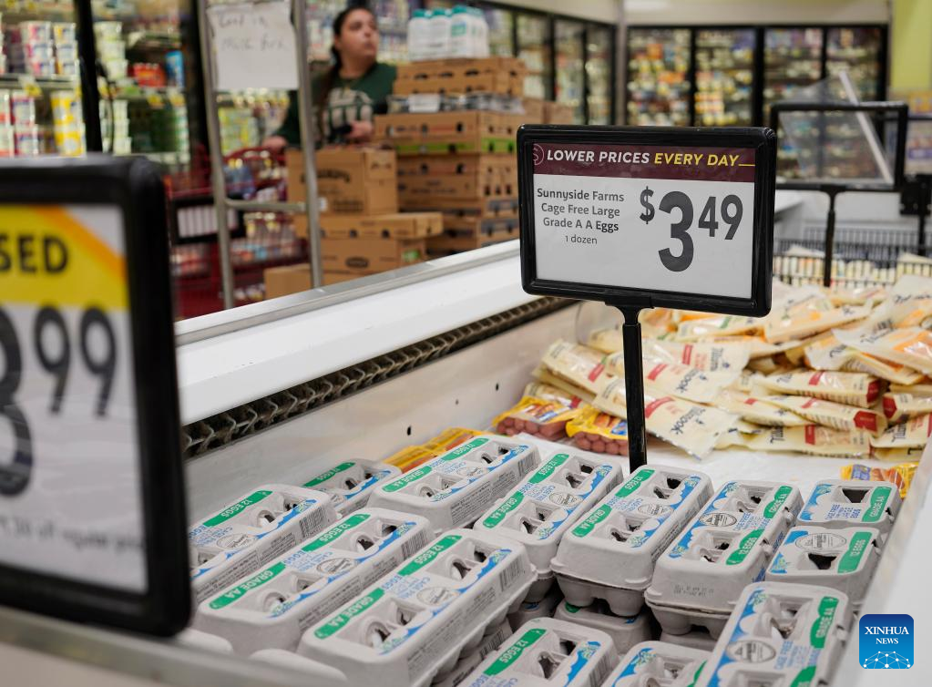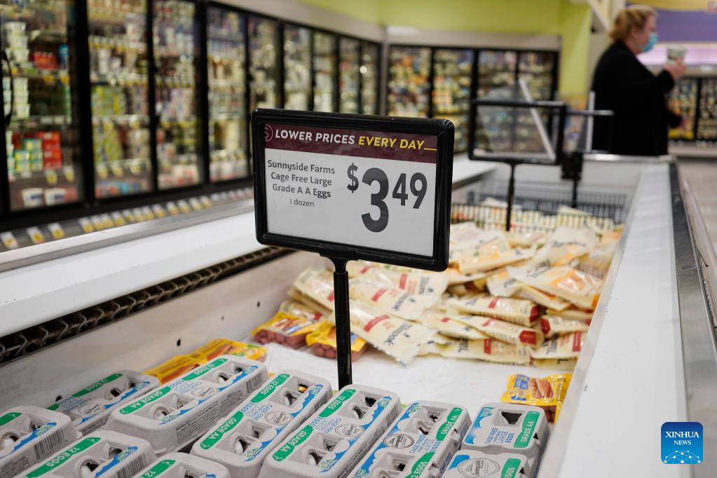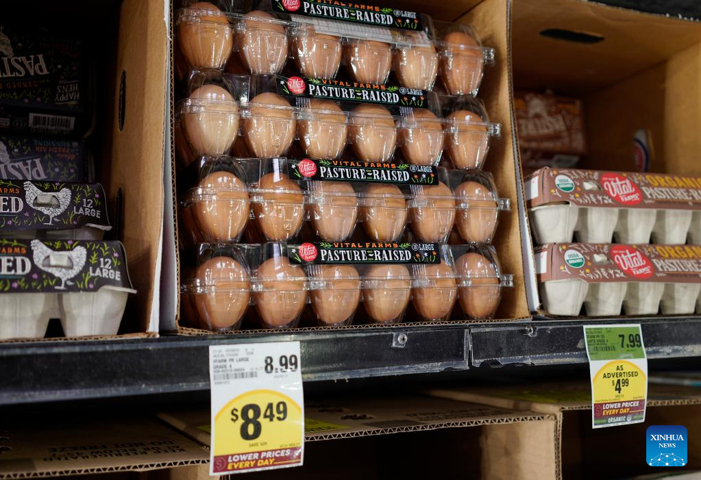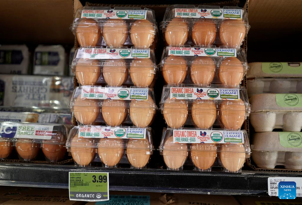 Photo taken on April 5, 2022 shows eggs for sale at a supermarket in Millbrae, California, the United States. The outbreaks of highly pathogenic H5N1 avian influenza, also known as bird flu, have affected more than 20 states in the United States, causing the price of eggs to soar. (Photo by Li Jianguo/Xinhua)
