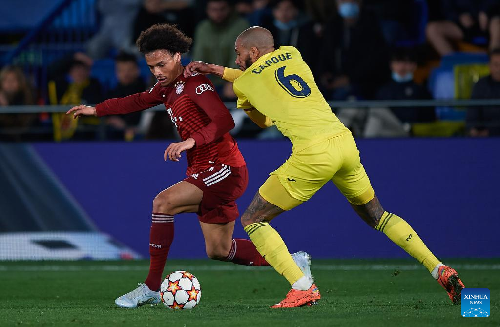 Etienne Capoue (R) of Villarreal vies with Serge Gnabry of Bayern Munich during a UEFA Champions League match between Villarreal CF of Spain and Bayern Munich of Germany at La Ceramica Stadium in Vila-Real, Spain, on April 6, 2022. (str/Xinhua)