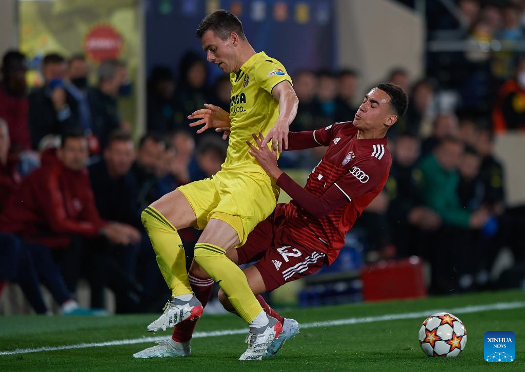 Giovani Lo Celso (L) of Villarreal vies with Jamal Musiala of Bayern Munich during a UEFA Champions League match between Villarreal CF of Spain and Bayern Munich of Germany at La Ceramica Stadium in Vila-Real, Spain, on April 6, 2022. (str/Xinhua)