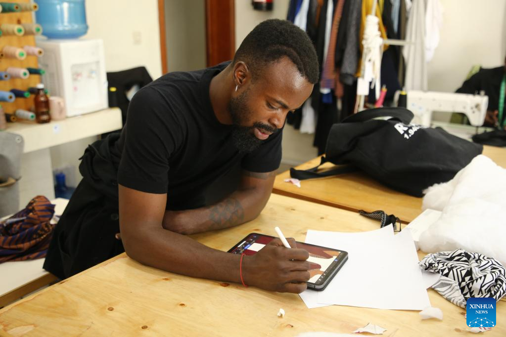 Moses Turahirwa, the creative director and founder of Moshions brand, designs new clothes at upstairs of the Moshions shop in Kigali, Rwanda on April 1, 2022. (Photo by Huang Wanqing/Xinhua)