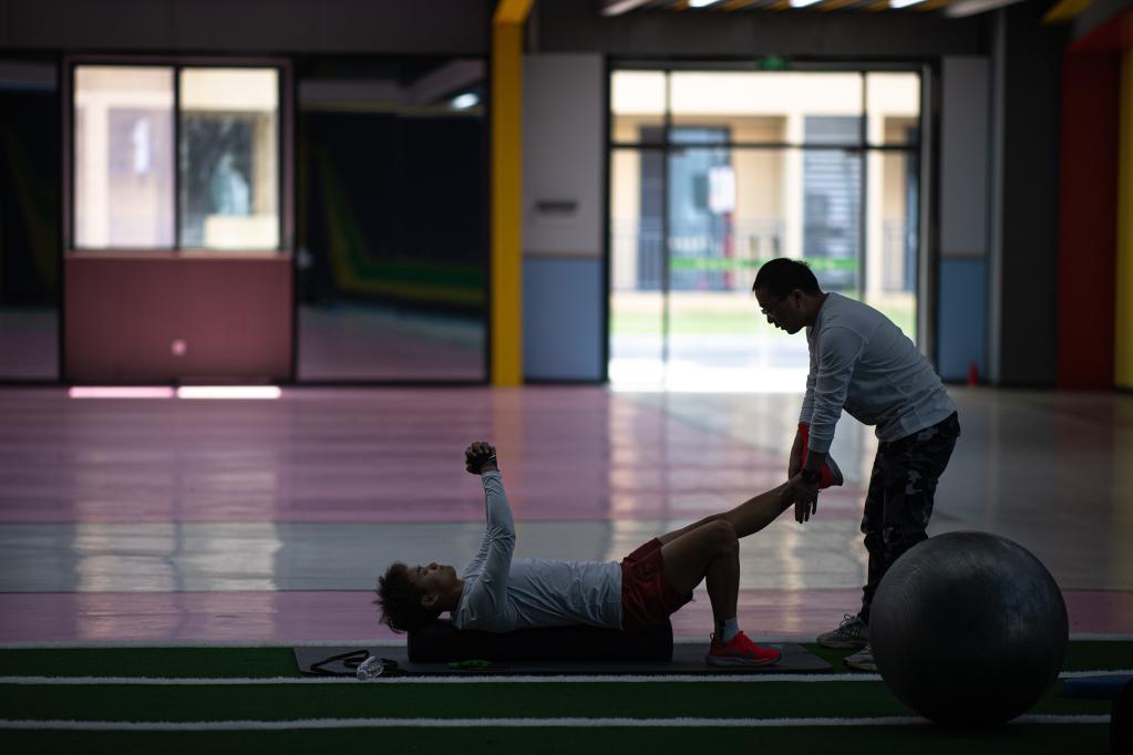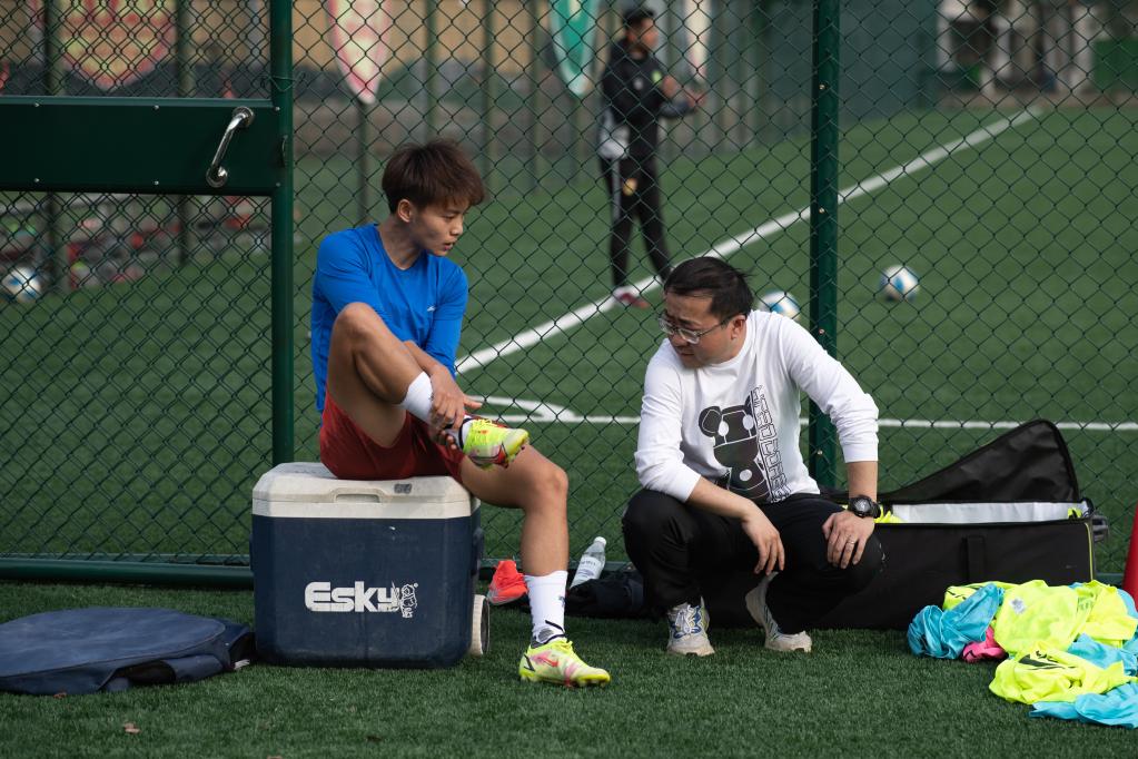 Chinese female football player Wang Shuang (L) talks to her physical therapist during a training session in Wuhan of central China's Hubei Province, on April 6, 2022. (Xinhua/Xiao Yijiu)