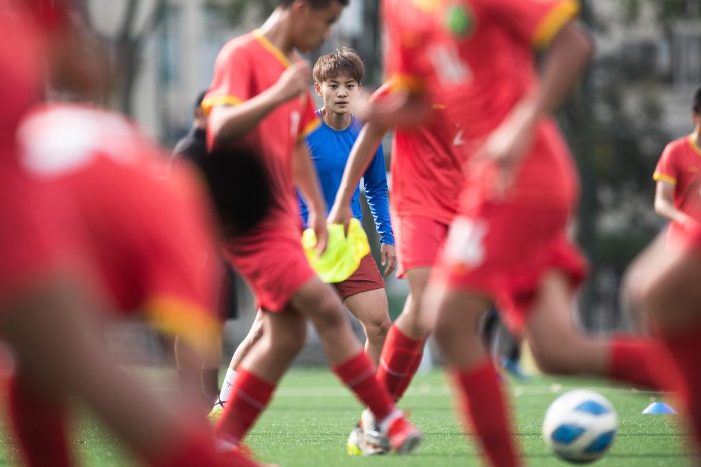 Chinese female football player Wang Shuang (L) attends a training session in Wuhan of central China's Hubei Province, on April 6, 2022. (Xinhua/Xiao Yijiu)