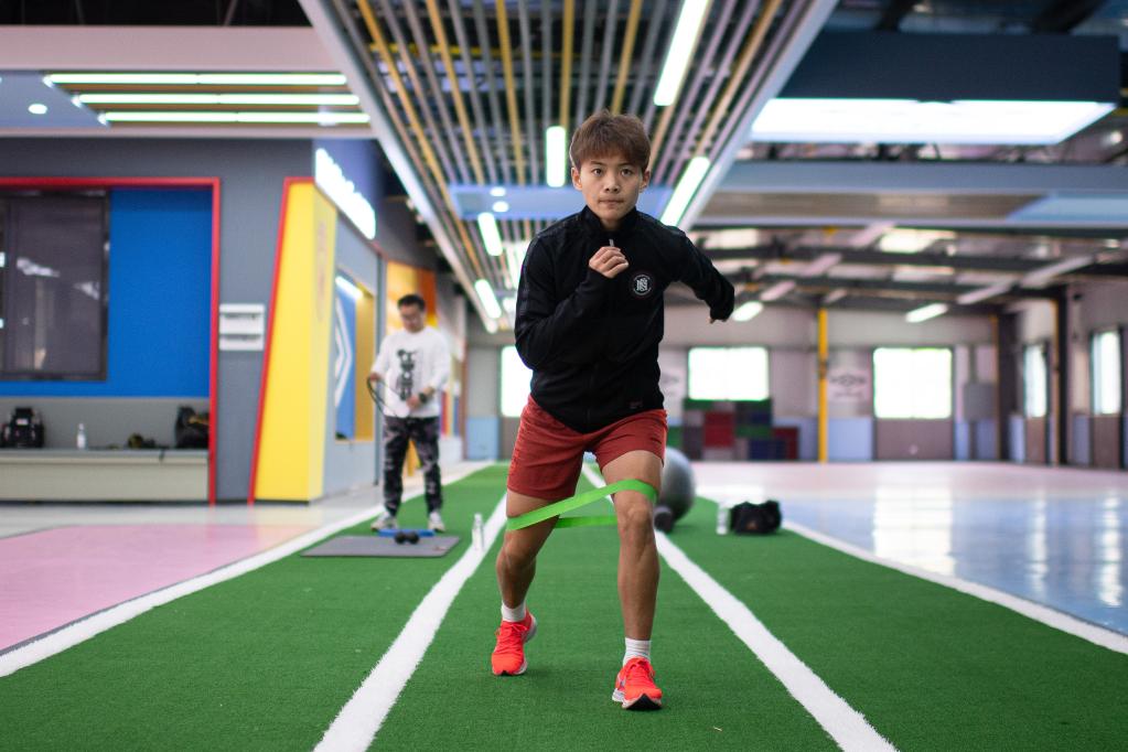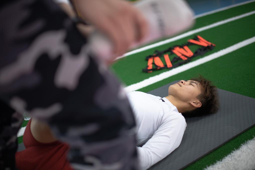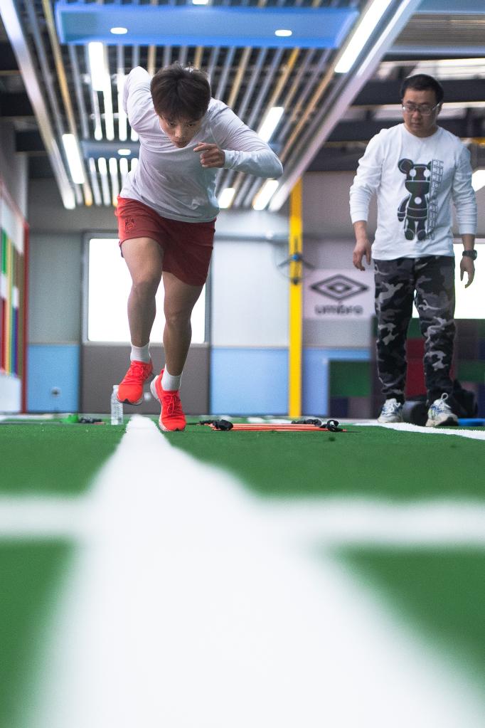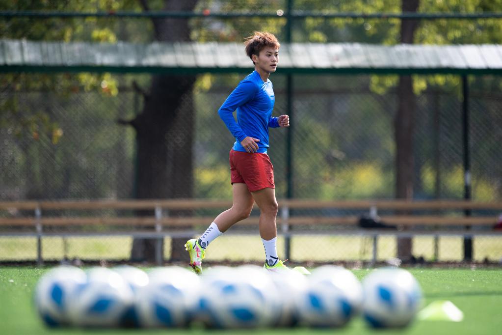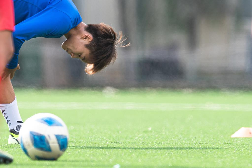 Chinese female football player Wang Shuang attends a training session in Wuhan of central China's Hubei Province, on April 6, 2022. (Xinhua/Xiao Yijiu)