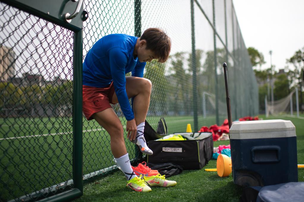 Chinese female football player Wang Shuang reacts after a training session in Wuhan of central China's Hubei Province, on April 6, 2022. (Xinhua/Xiao Yijiu)