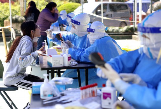 Medical workers take a swab sample from a resident for nucleic acid test at a community in Putuo District of Shanghai, east China, April 6, 2022. (Xinhua/Chen Fei)