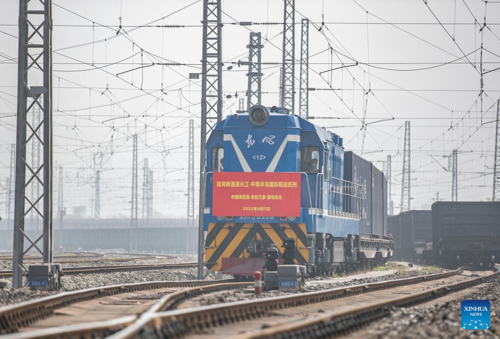 The first outbound international rail-sea freight train from China's Yangtze River to Indo-China Peninsula leaves Guoyuan Port in southwest China's Chongqing Municipality for Myanmar's Yangon, April 7, 2022.